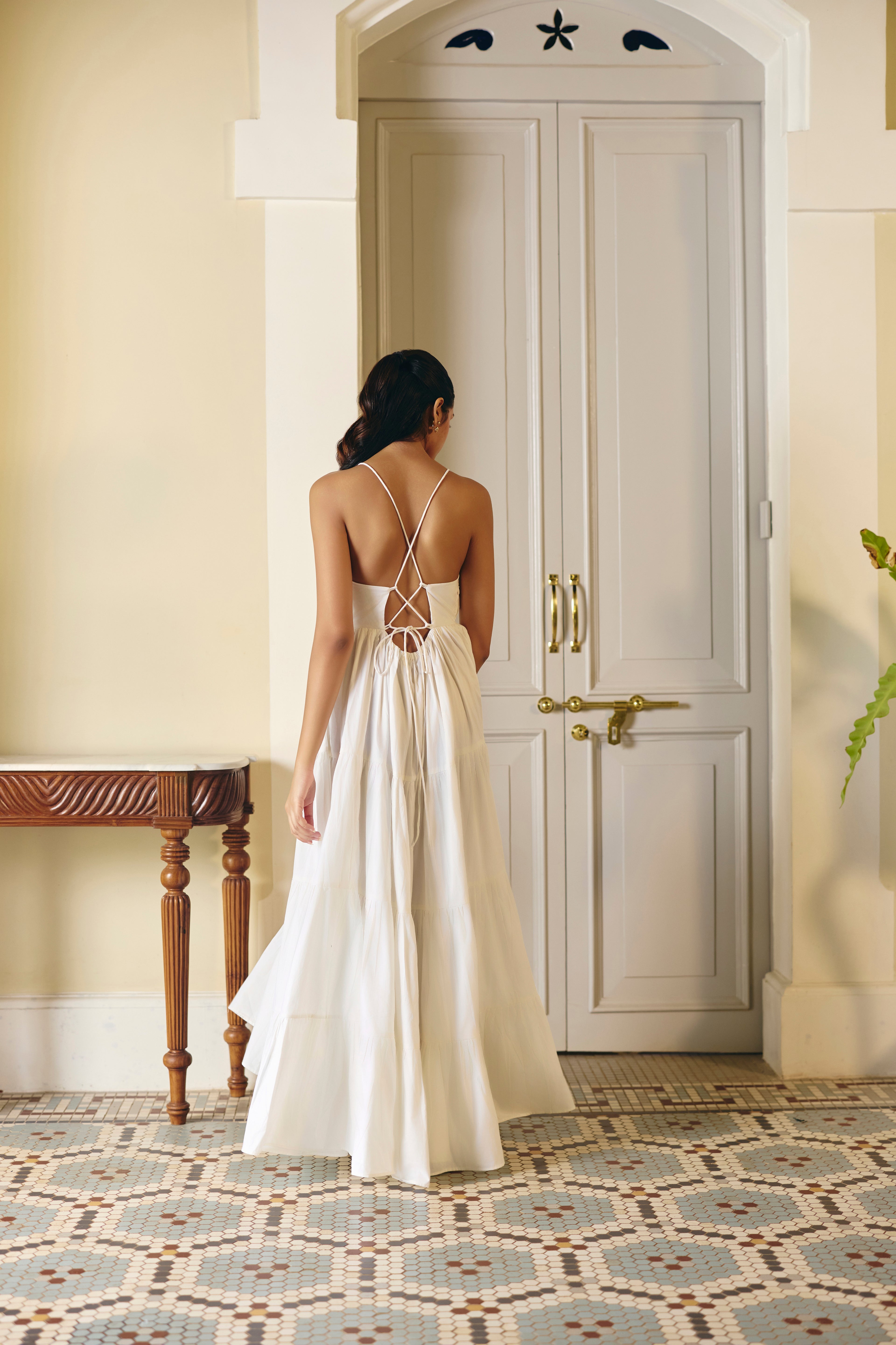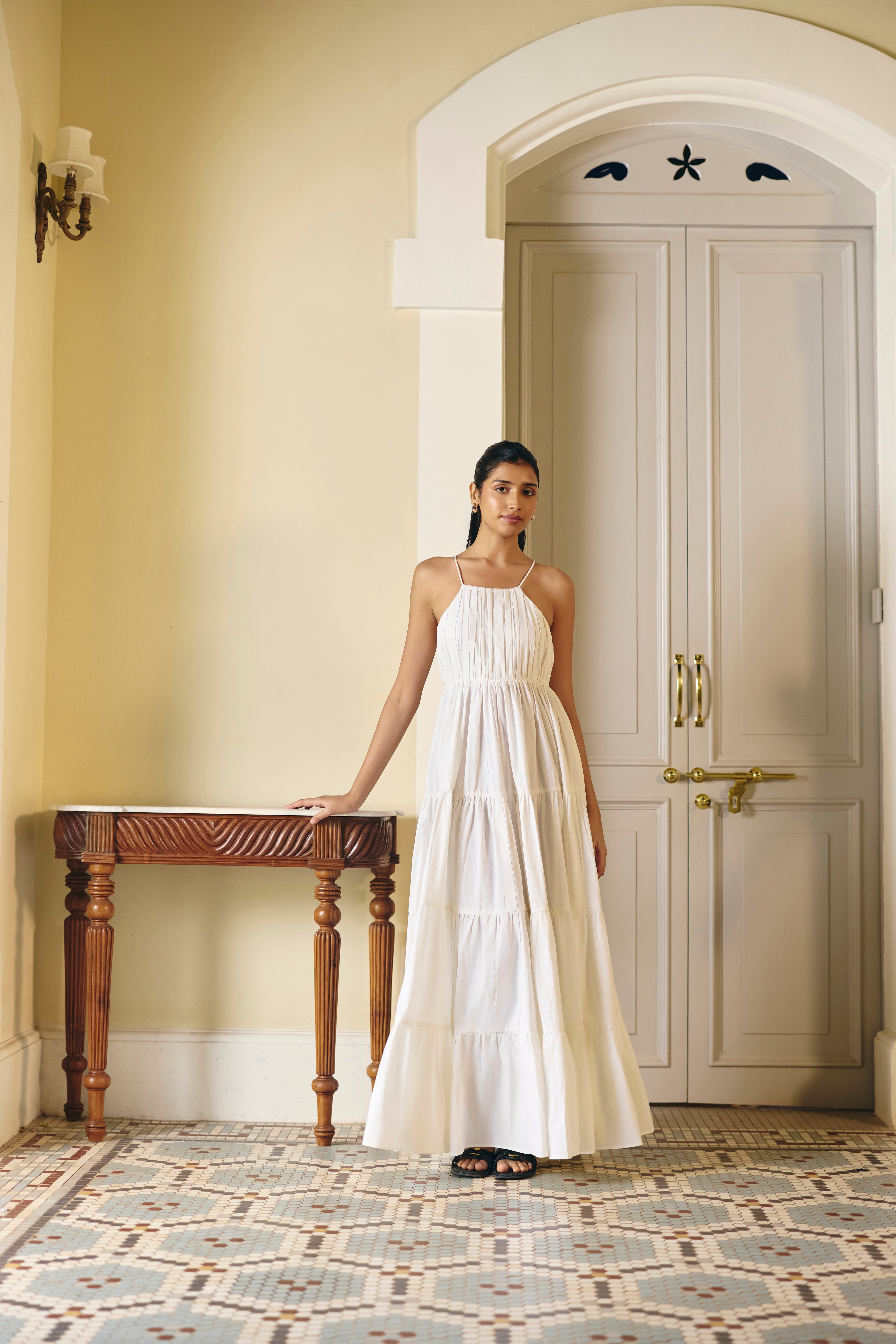 Effortlessly elegant, our white tier dress is a vision of graceful movement. The dress features a beautifully gathered tiered skirt below the waist, creating a flowing silhouette. A sophisticated halter strap neckline crisscrosses at the back, giving it a stunning backless design that’s perfect for a chic and comfortable look.