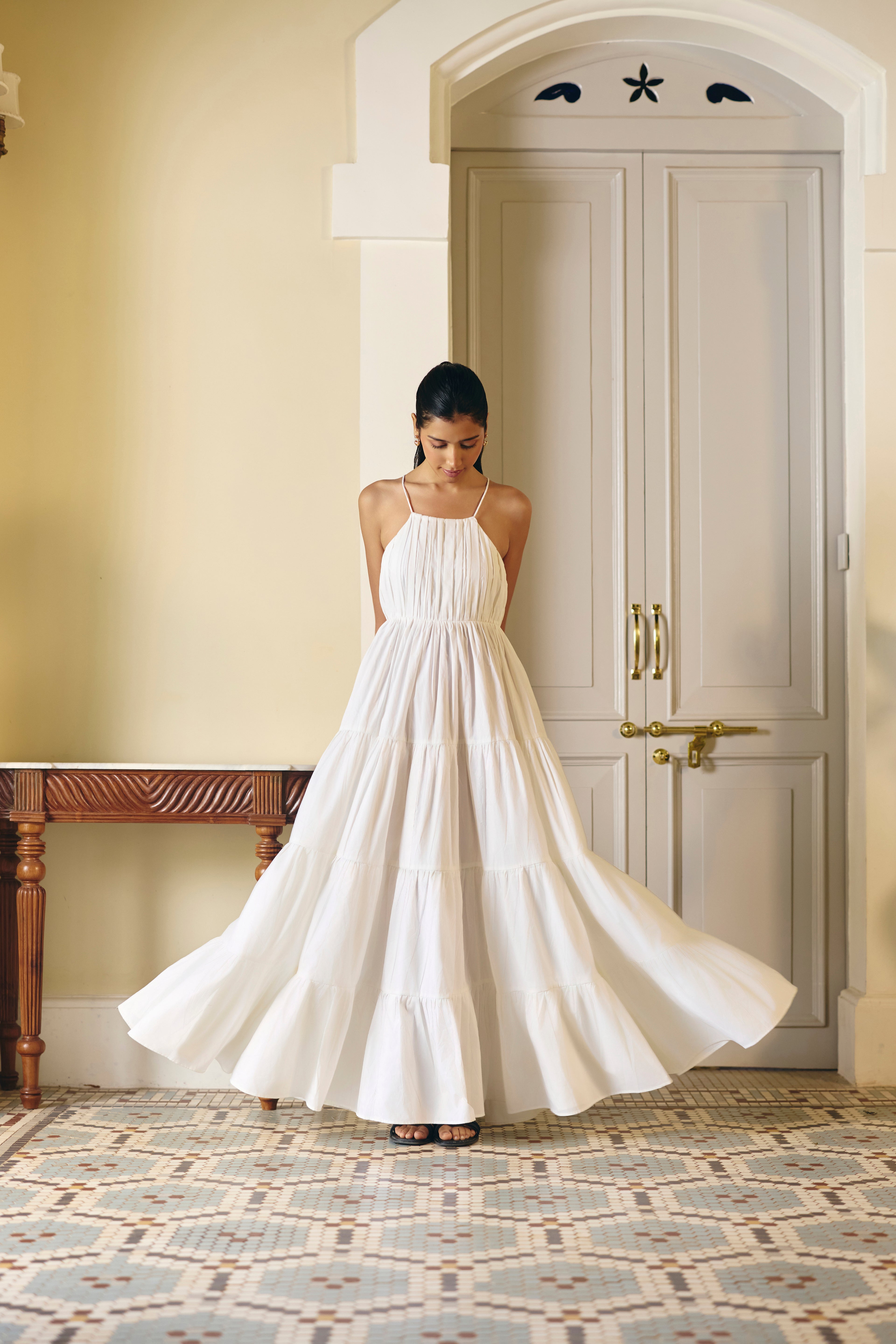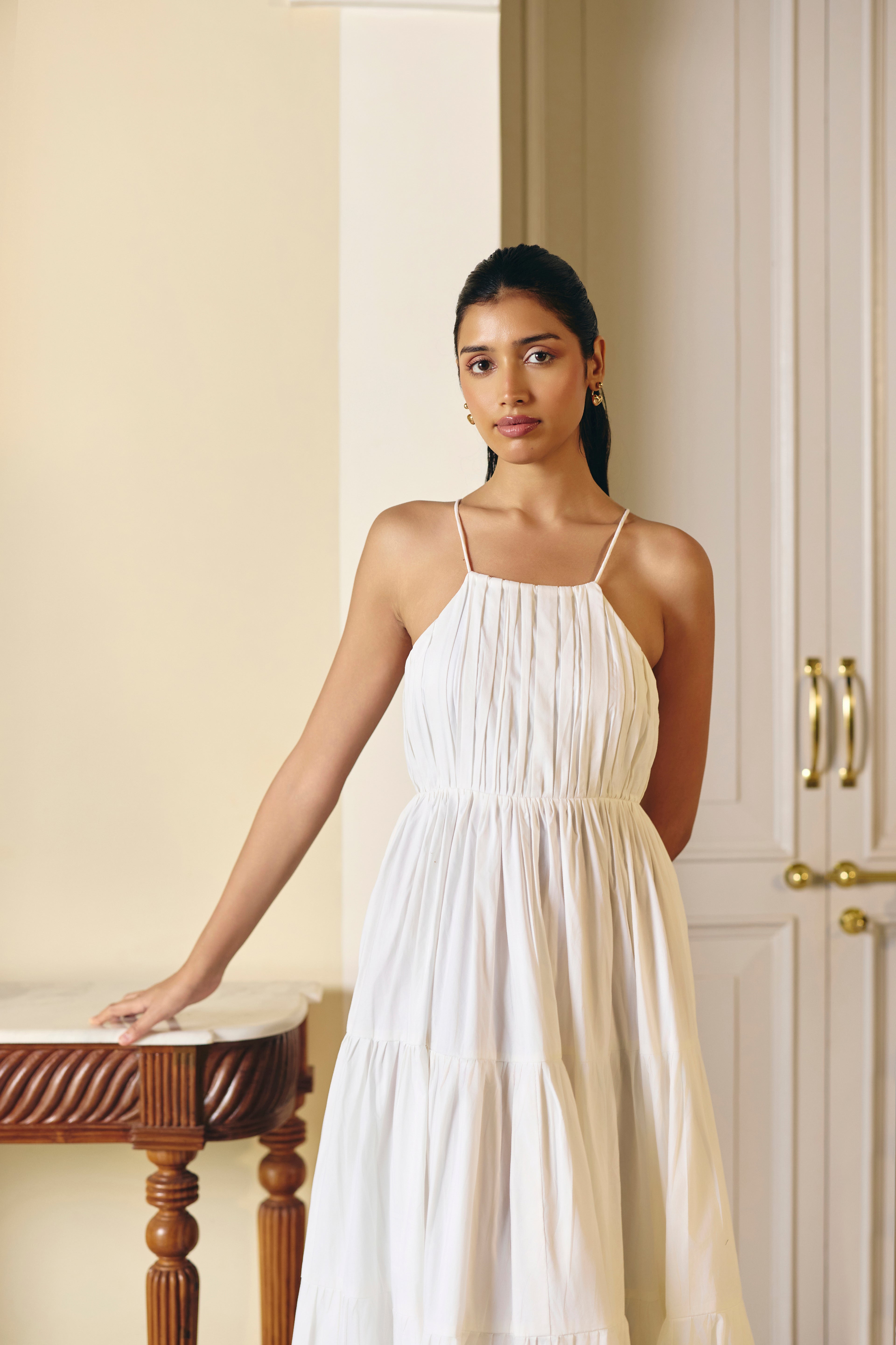 Pleated White Cotton Tier Dress