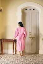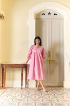 Float through your day in our lovely maxi dress. The dress features a stylish yoke panel with a V-striped print and a split neckline, adorned with playful drawstrings that have sweet fabric hearts. With its elbow-length bubble sleeves and a gathered A-line silhouette, this dress offers a perfect blend of comfort and whimsical charm.