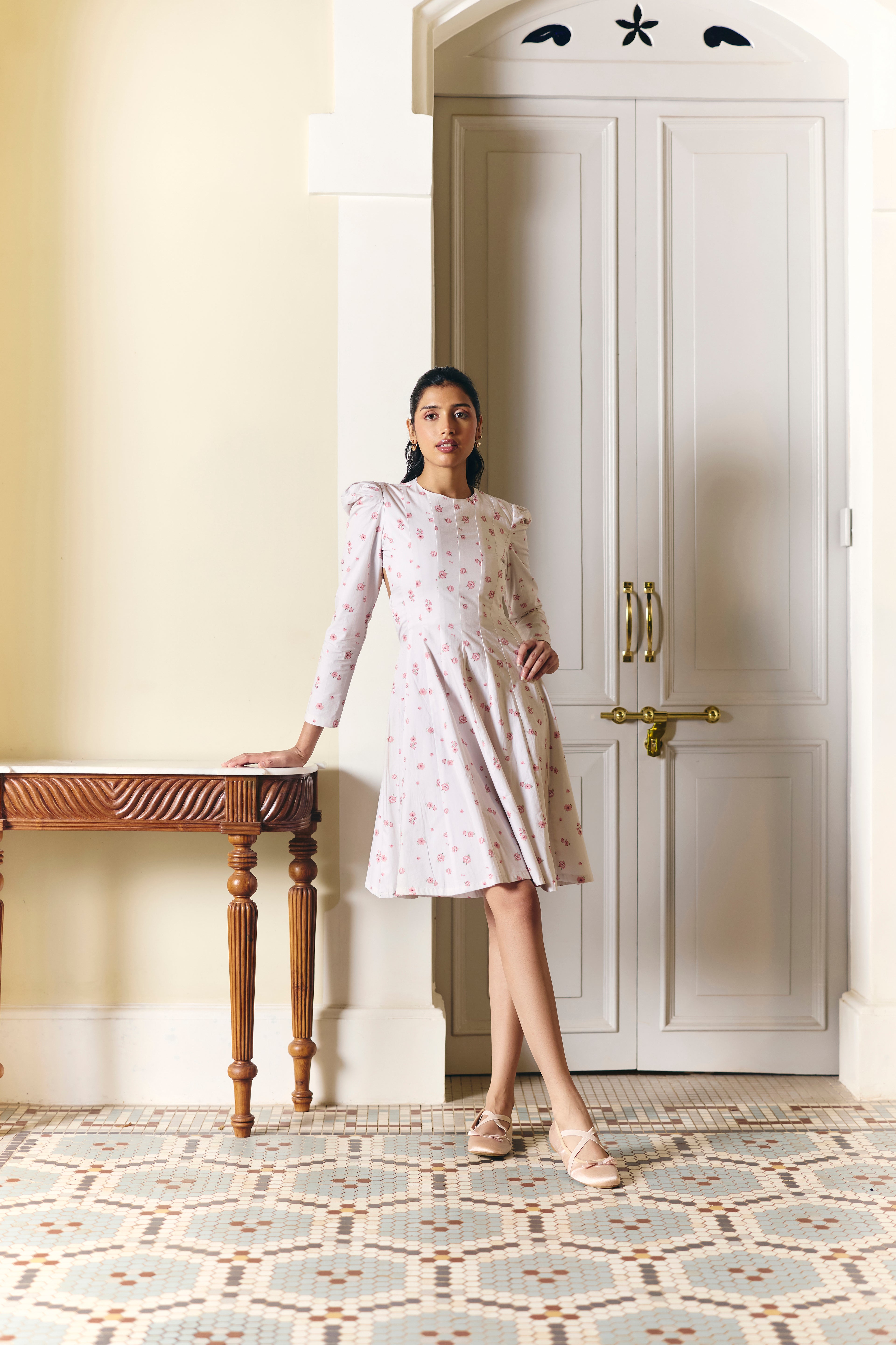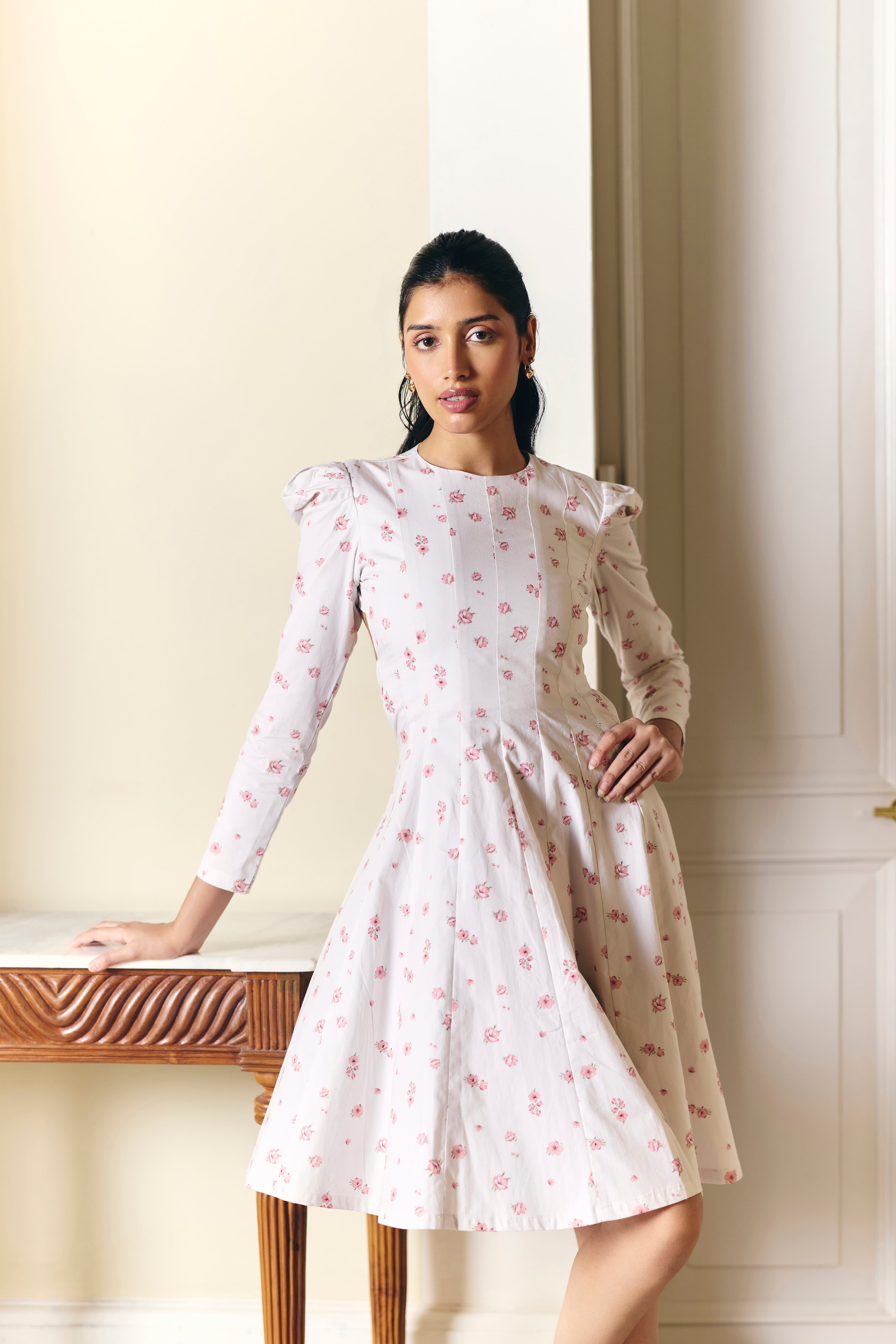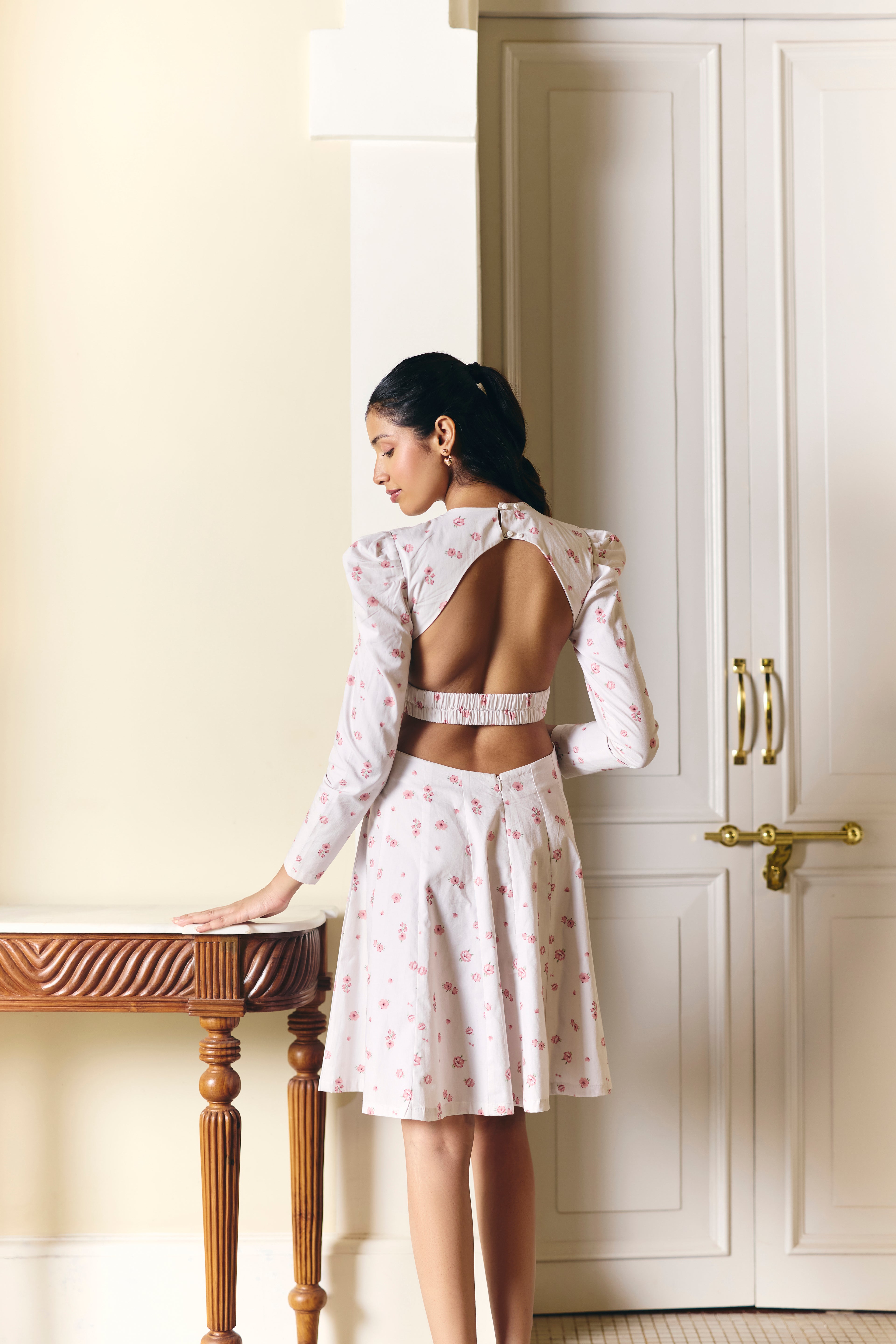Step into blooming elegance with our classic floral printed dress. This paneled dress features stylish full sleeves and a unique backless design with a cinched elastic strap at the waist. The buttoned strap at the back provides a secure and adjustable fit, making it a perfect blend of comfort and chic style.