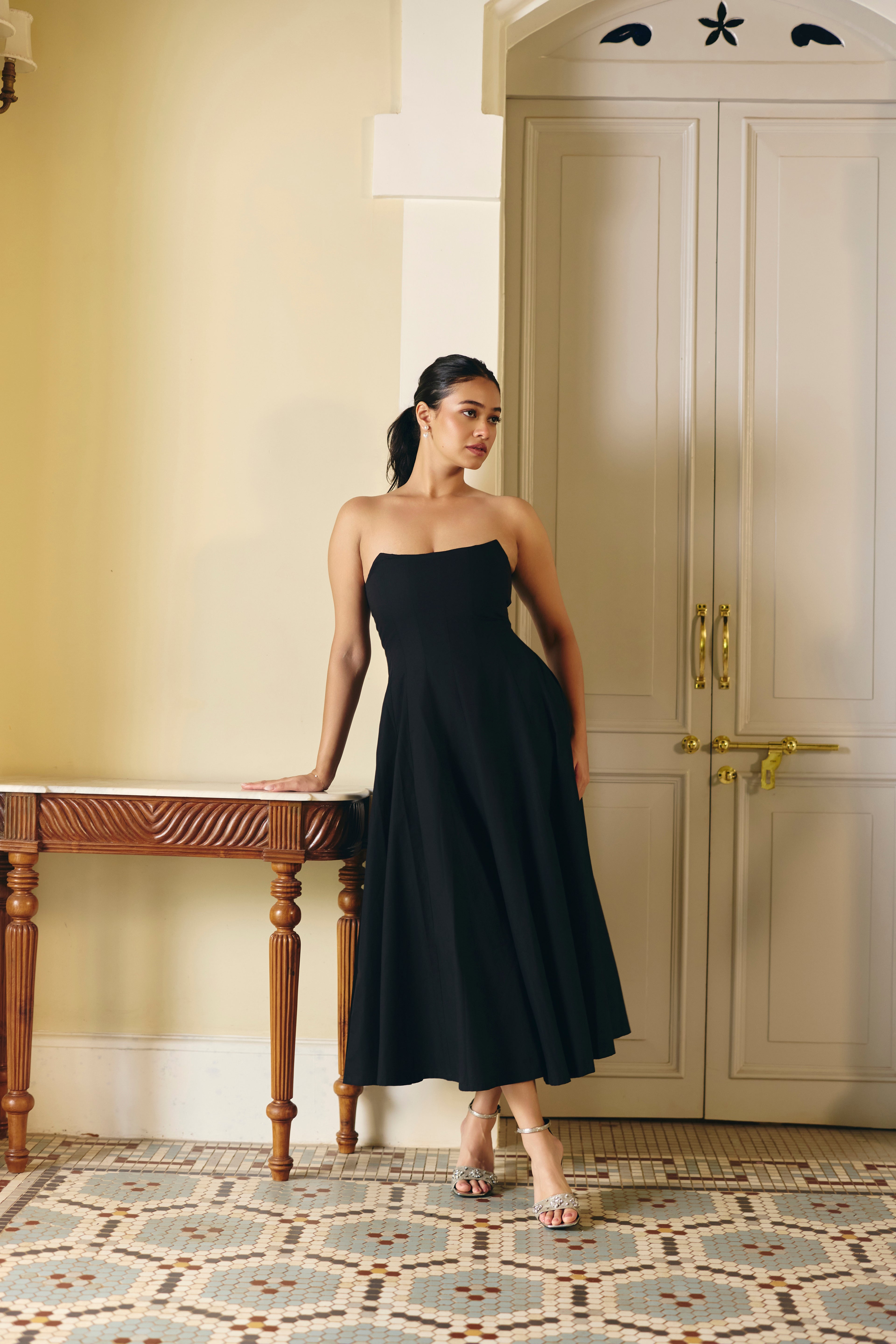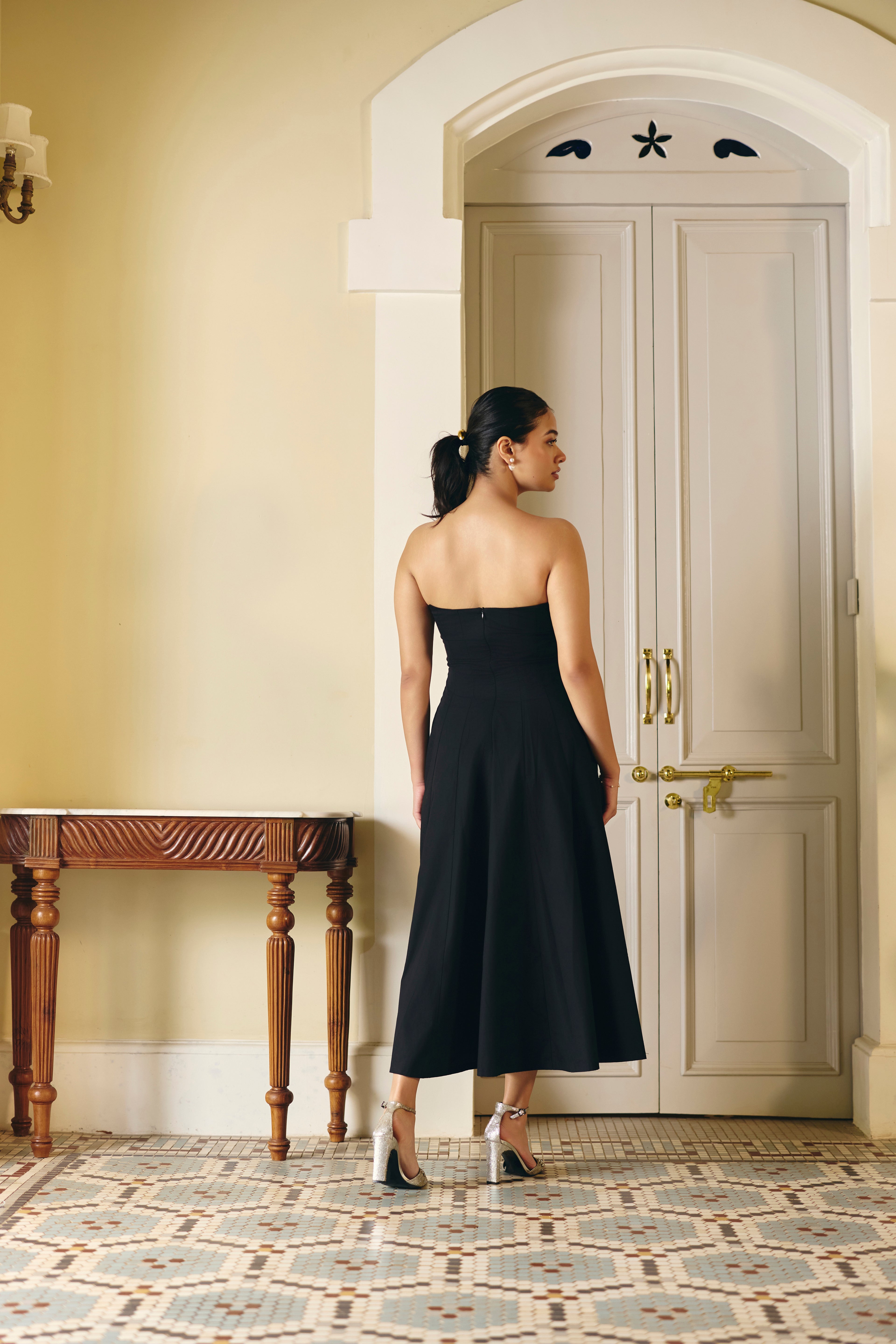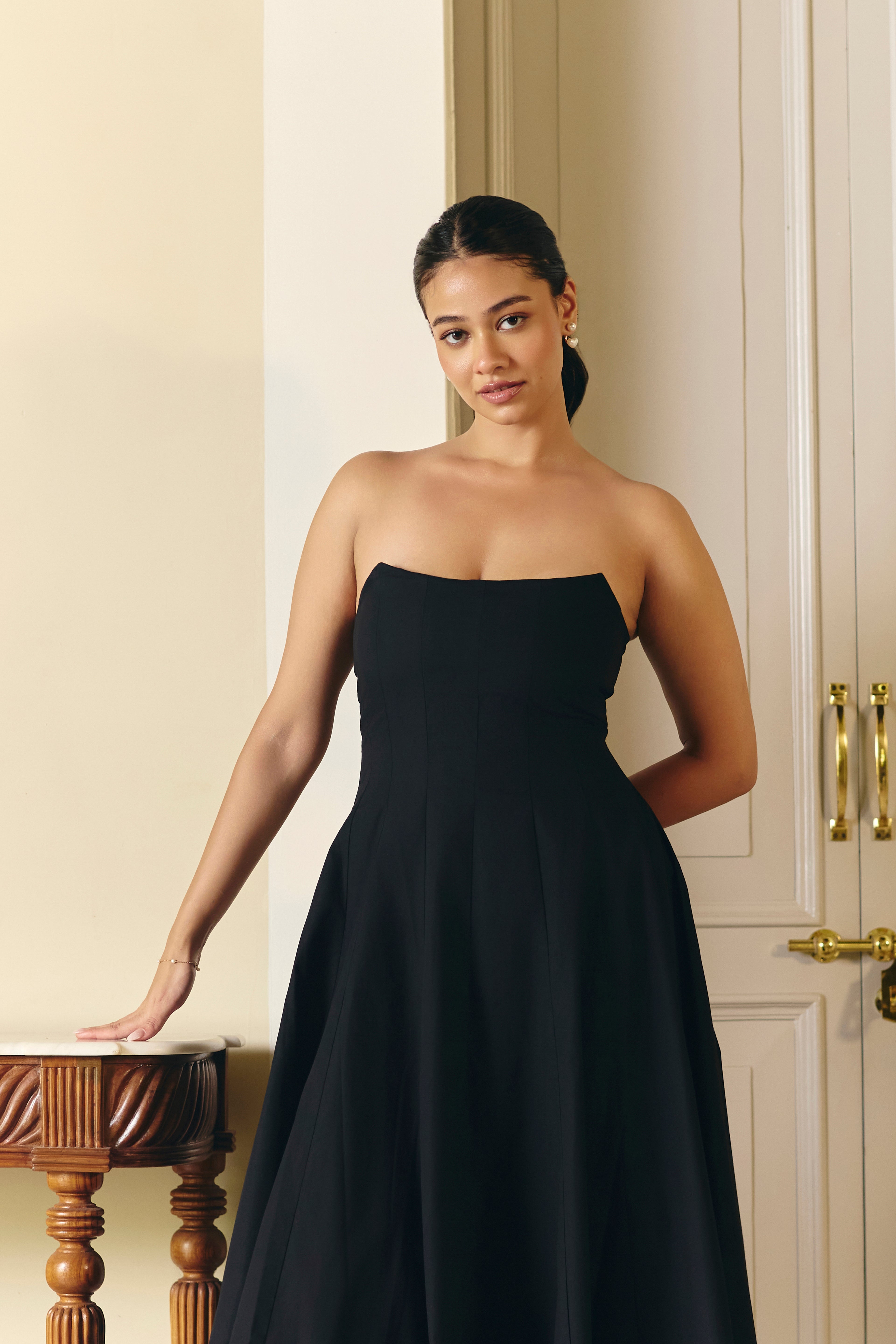 Unleash your inner confidence in our elegant black corset dress. The paneled design creates a beautiful corset-like structure at the top, transitioning into a flattering A-line silhouette below the waist. A structured neckline, and concealed back zipper complete this sophisticated and timeless piece, perfect for any special occasion.
