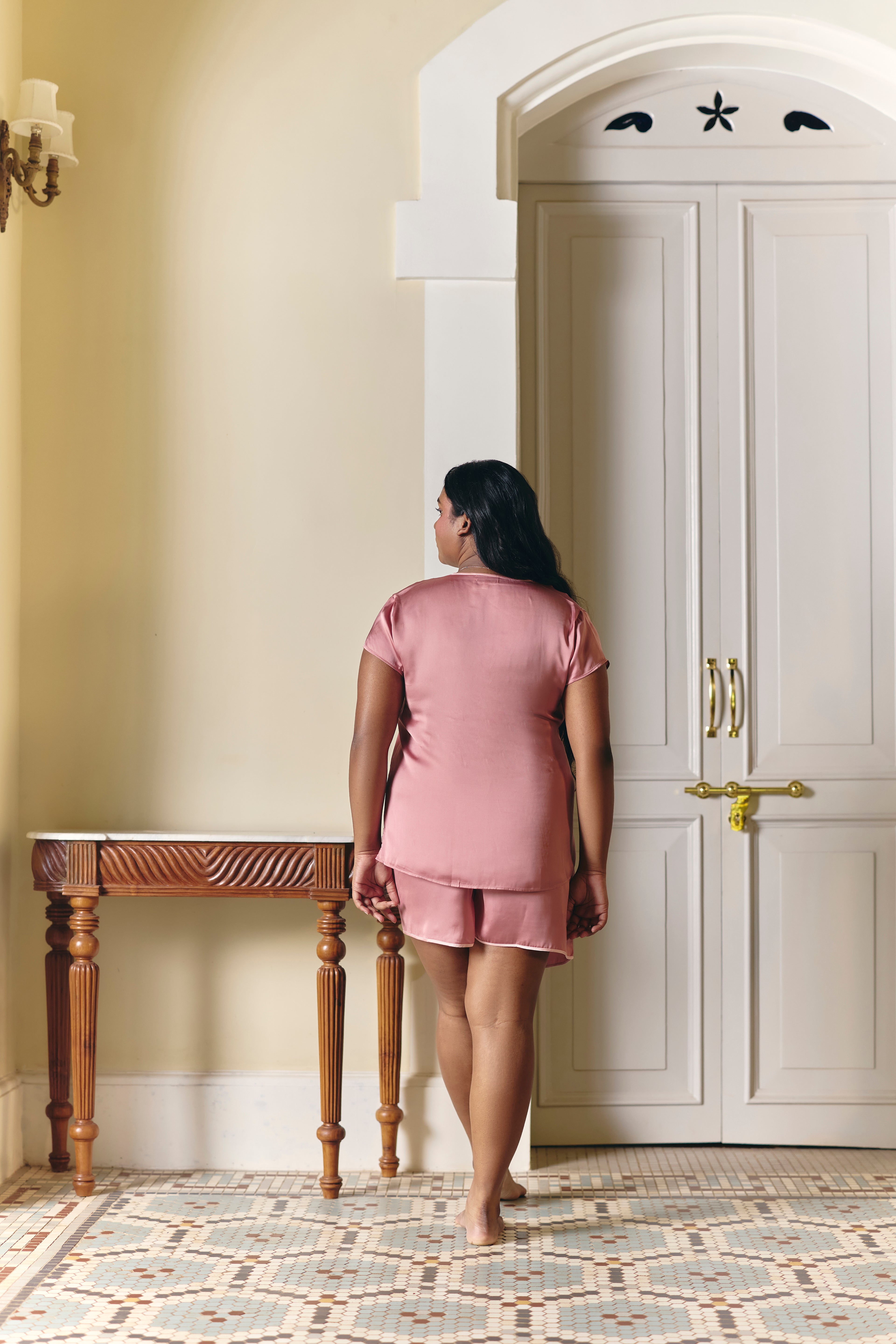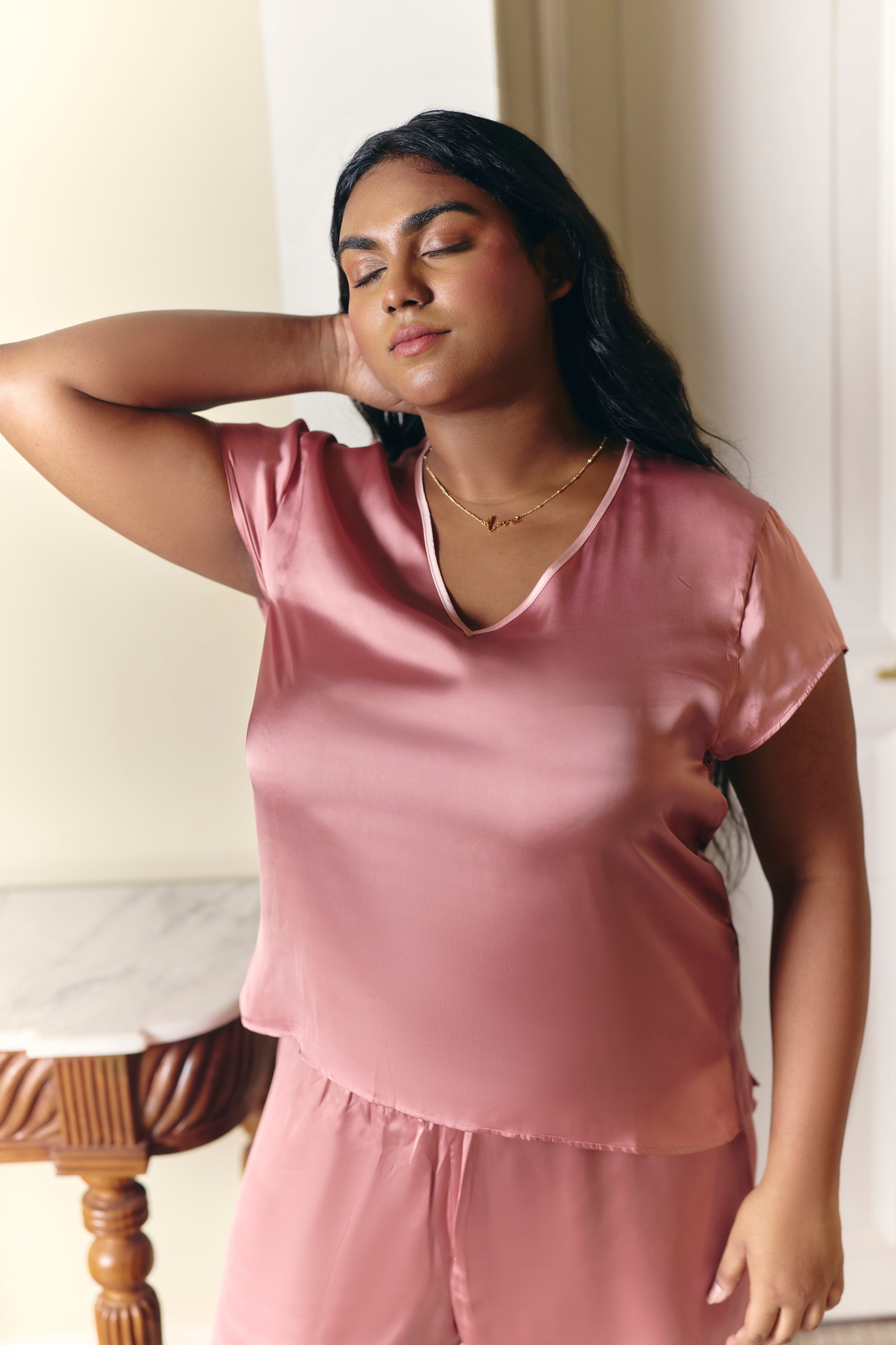 Experience a blend of comfort and style with our elegant satin shorts set. The V-neck top, featuring a sophisticated piping detail and chic side slits, pairs perfectly with the matching shorts, which also have piping on the hem. Ideal for a relaxed night or a cozy day in, this luxurious set is designed for effortless lounging.