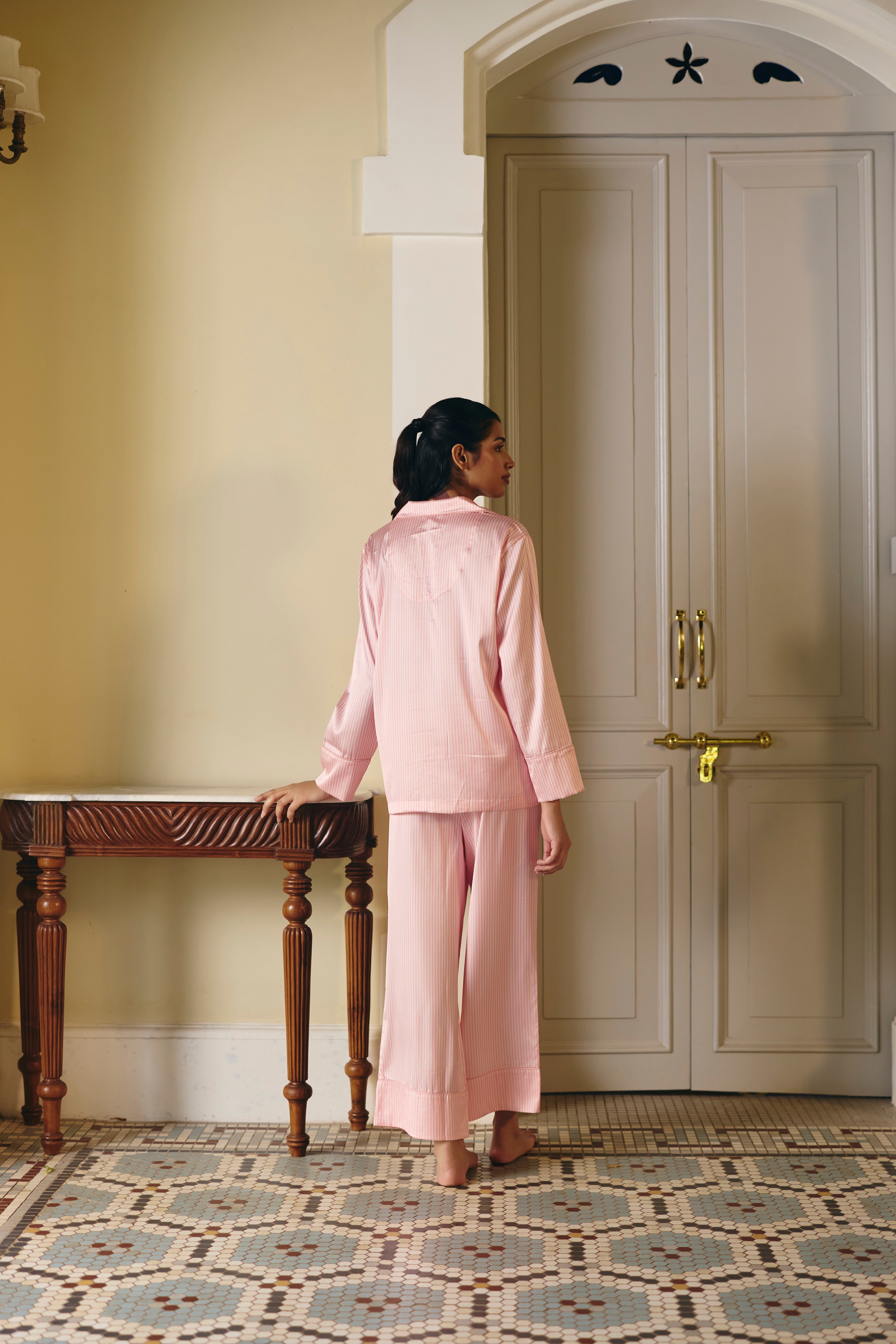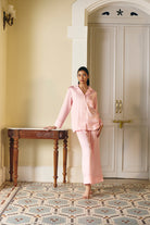 Wrap yourself in comfort and elegance with our classic printed satin pajama set. The relaxed-fit shirt, featuring the brand's signature pocket, adorned with sophisticated piping, pairs perfectly with the drawstring pajamas, also detailed with elegant piping. This two-piece set blends luxurious feel with timeless style, making it the perfect choice for a comfortable night's sleep or a leisurely day at home.