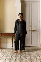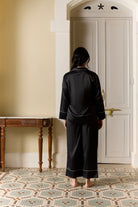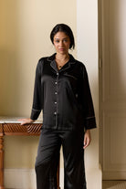 Wrap yourself in comfort and elegance with our classic satin pajama set. The relaxed-fit shirt, complete with a pocket and sophisticated piping, pairs perfectly with the drawstring pajamas, also detailed with elegant piping. This two-piece set blends luxurious feel with timeless style, making it the perfect choice for a comfortable night's sleep or a leisurely day at home.