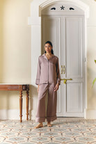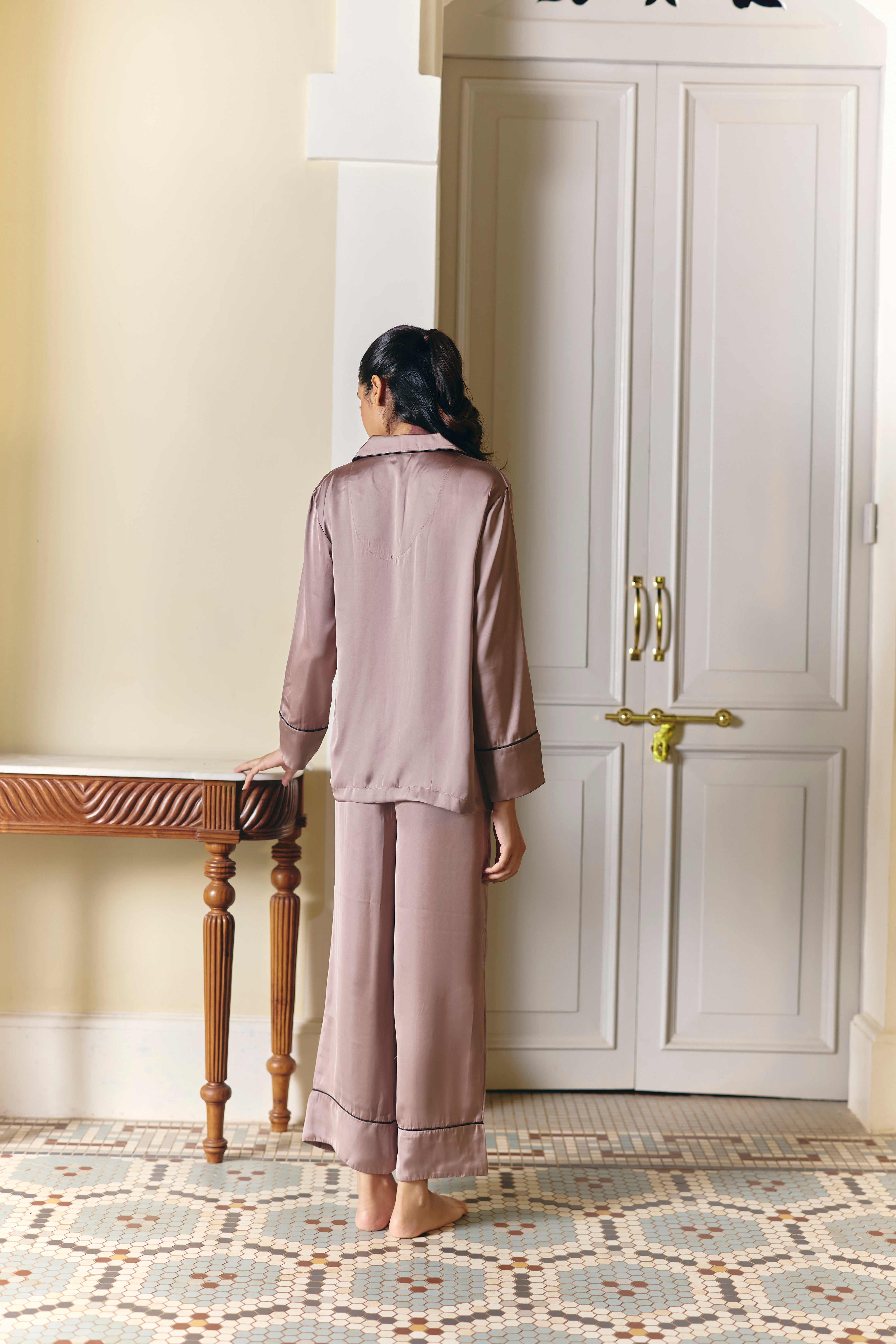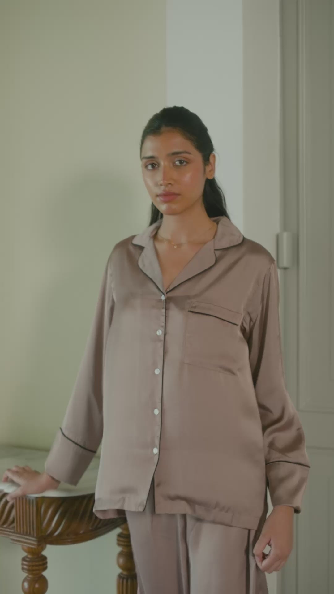 Wrap yourself in comfort and elegance with our classic satin pajama set. The relaxed-fit shirt, complete with a pocket and sophisticated piping, pairs perfectly with the drawstring pajamas, also detailed with elegant piping. This two-piece set blends luxurious feel with timeless style, making it the perfect choice for a comfortable night's sleep or a leisurely day at home.