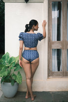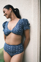 Make a splash this summer in our beautiful indigo bikini set. The bikini top features a plunging neckline, adorable puff sleeves, and a cute ruched detail at the front, while the bikini bottom offers a flattering hipster cut. This two-piece set is both stylish and comfortable, perfect for a day by the water.