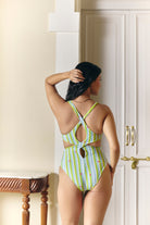 Dive into style with our playful one-piece swimsuit, featuring a striking stripe print adorned with tiny hearts. The sleek front silhouette is complemented by a chic crisscross back, adding a touch of modern flair. Perfect for making a splash, this swimsuit combines fun design with effortless style.