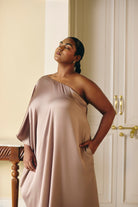 Embrace timeless elegance in our stunning champagne one-shoulder dress. The beautifully draped silhouette flows gracefully, creating a sophisticated and flattering look. This luxurious and chic piece is perfect for a special evening out.