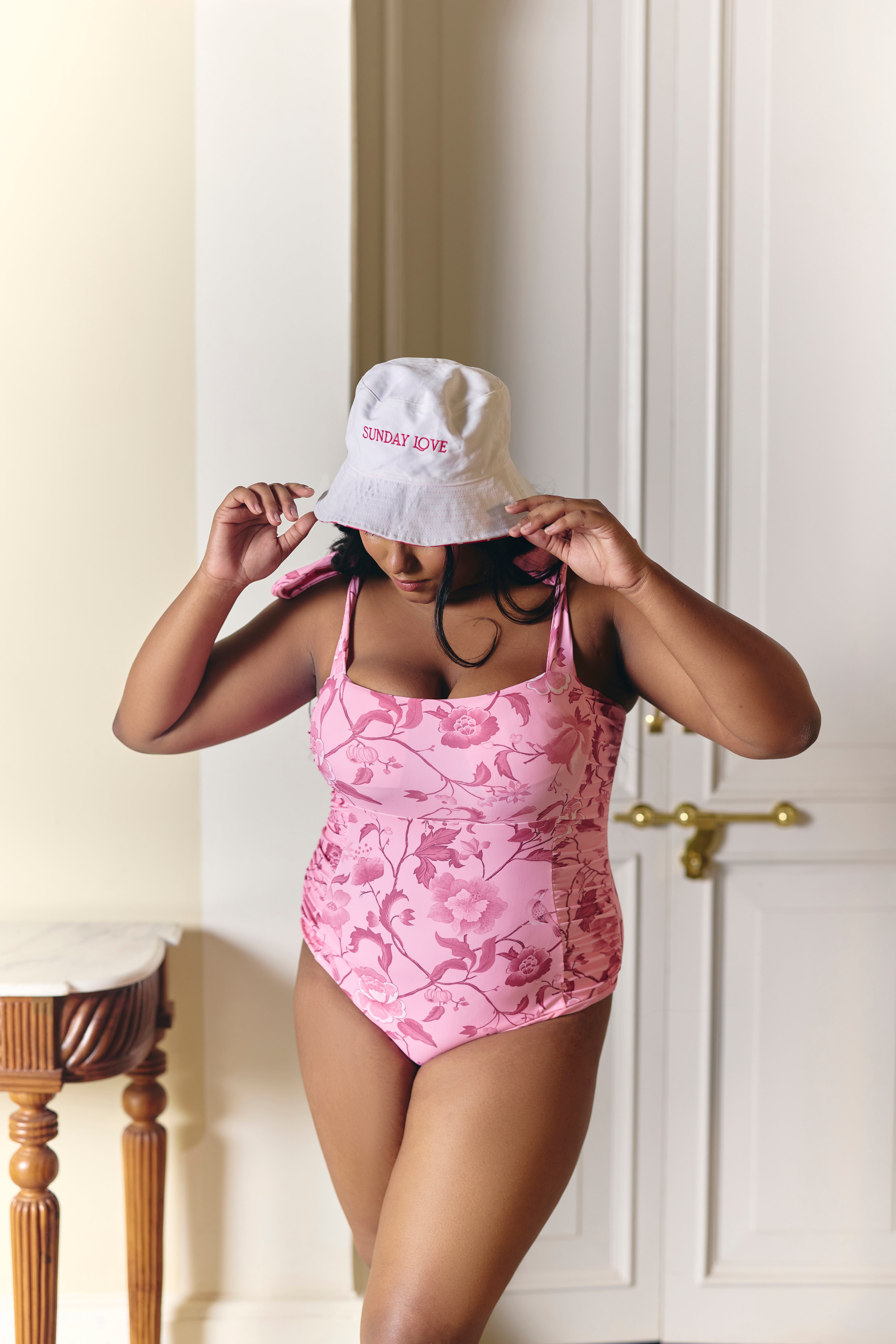 Dive into summer with our beautiful pink floral one-piece swimsuit. The front features graceful panels and delicate ruching, creating a flattering and refined silhouette. An elegant deep square back and dainty tie-up adjustable shoulder straps complete this charming design, offering a perfect blend of poise and playful charm.