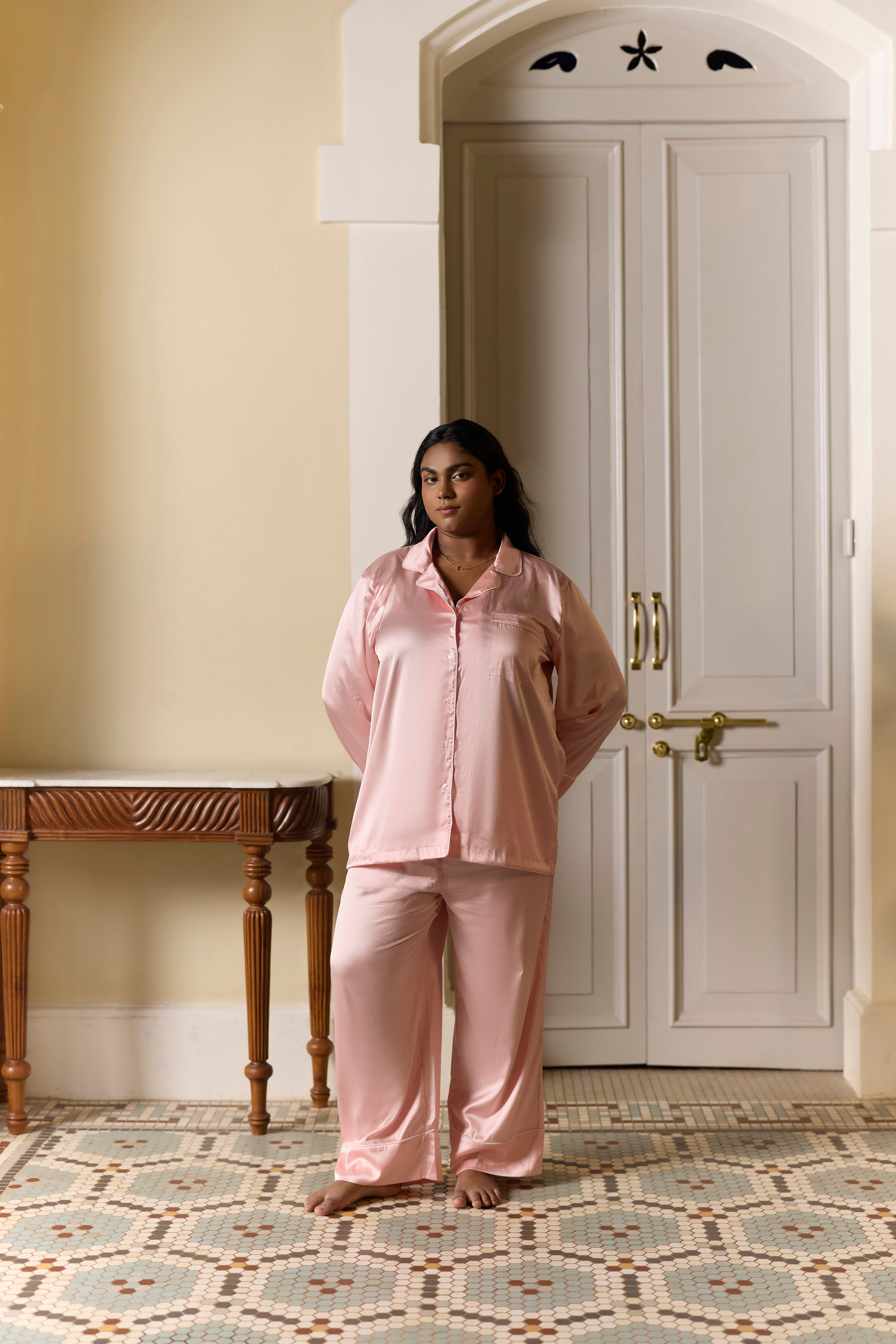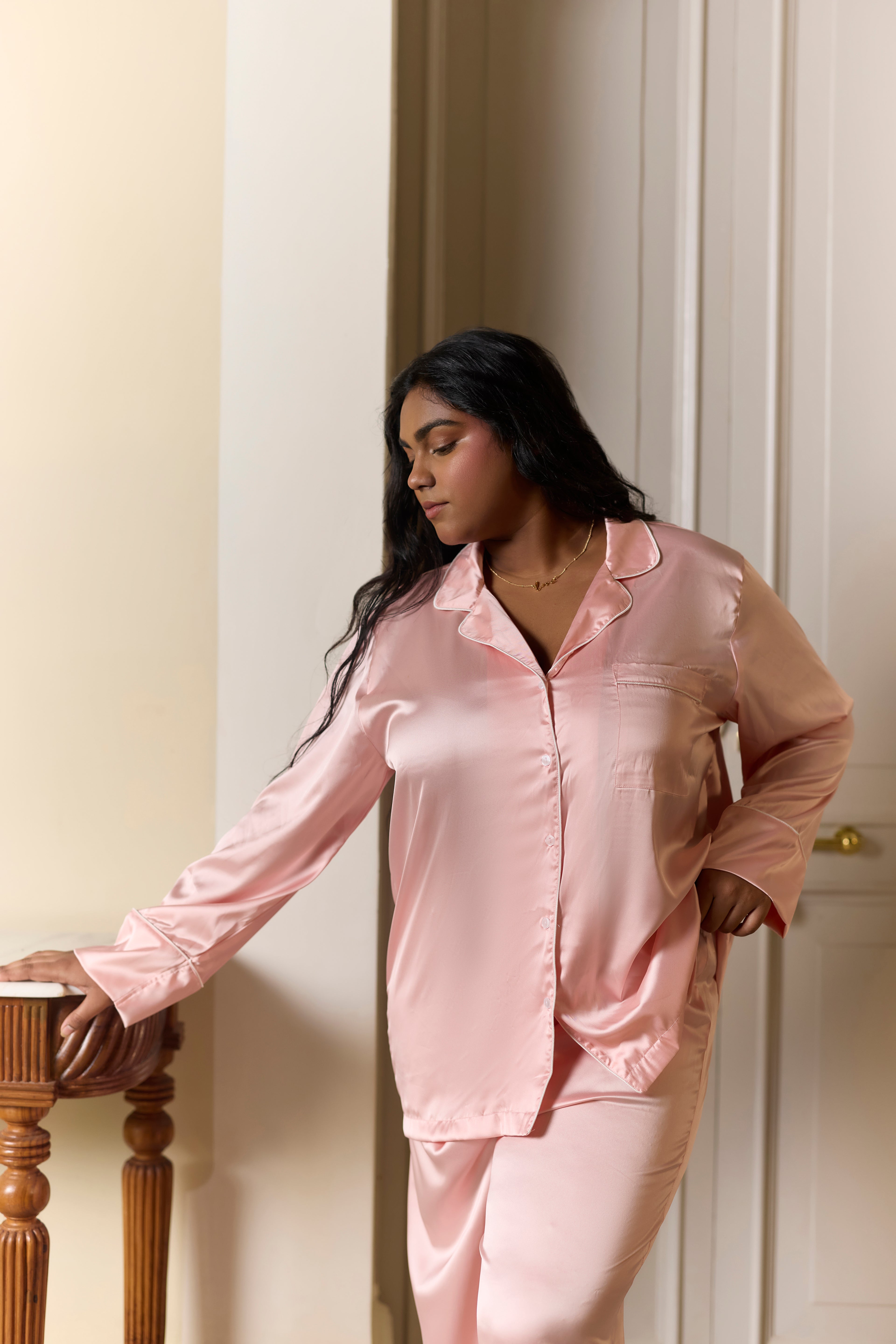 Wrap yourself in comfort and elegance with our classic satin pajama set. The relaxed-fit shirt, complete with a pocket and sophisticated piping, pairs perfectly with the drawstring pajamas, also detailed with elegant piping. This two-piece set blends luxurious feel with timeless style, making it the perfect choice for a comfortable night's sleep or a leisurely day at home.