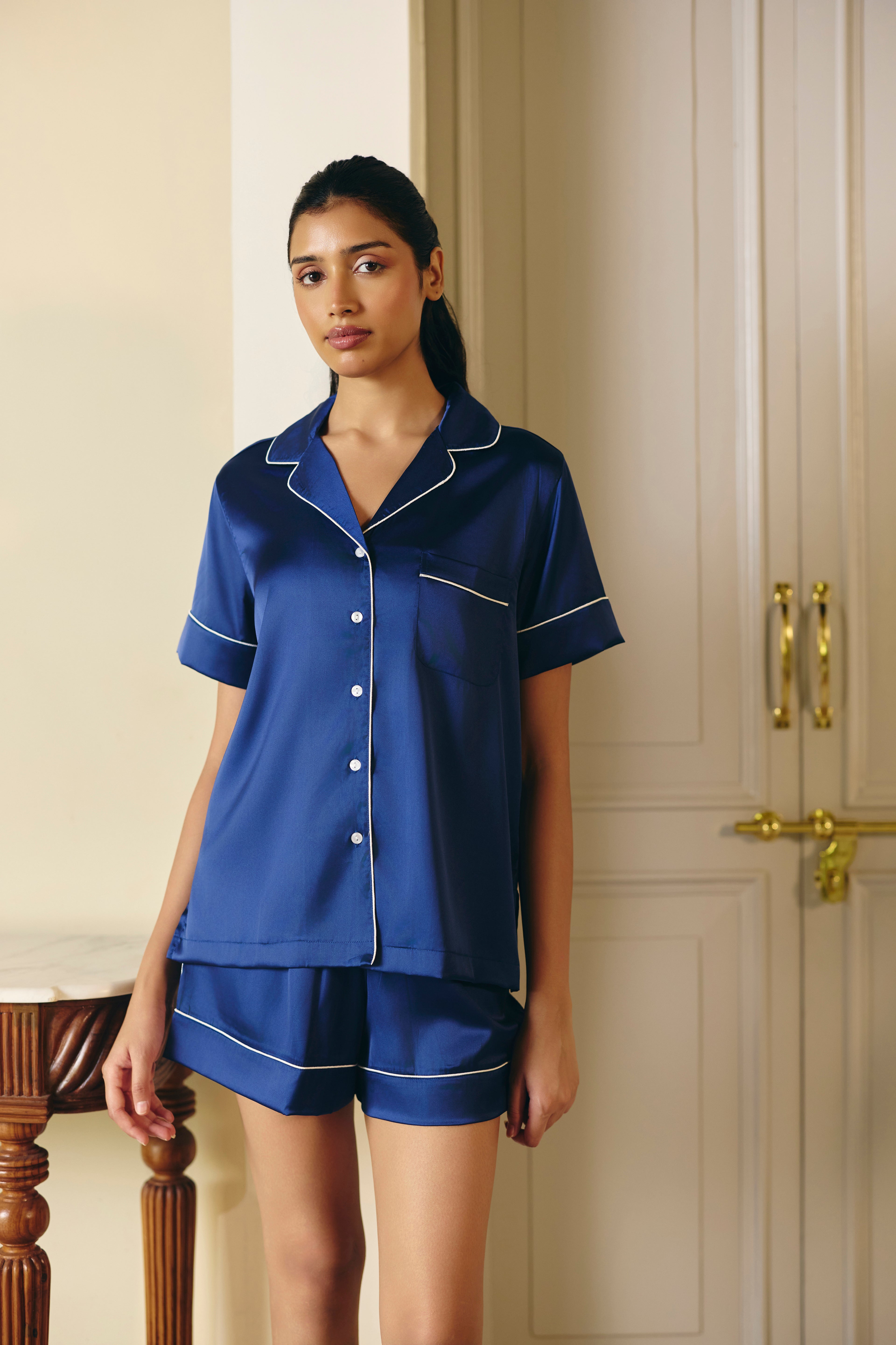 Our luxurious satin shorts set, featuring a relaxed-fit shirt with a chest pocket and matching shorts, is a dream for lounging in style. Elegant piping details on both pieces add a touch of classic sophistication. Effortlessly chic and comfortable, it's the perfect two-piece for a restful night or a cozy day in.